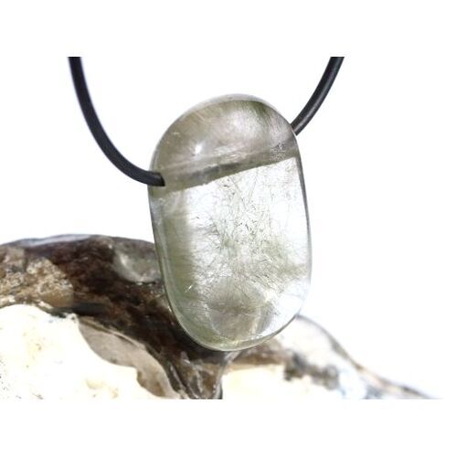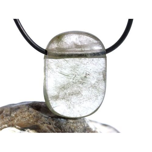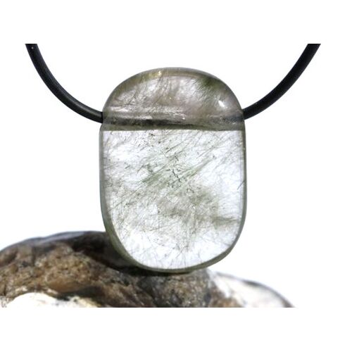 - Besonderheit: Sonderqualität! Edel-zeitlose, geometrisch und flach geschliffene Form - flach geschliffene Auflagen - beidseitig tragbar - Sonderbohrdurchmesser! Wunderschöne feine und im entsprechenden Licht und Winkel (z. B. Halogenspot) betrachtet schimmernde, grüne Aktionolithfasern. Der Bergkristall selbst ist kristallin klar/er!