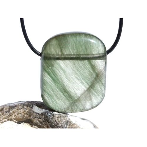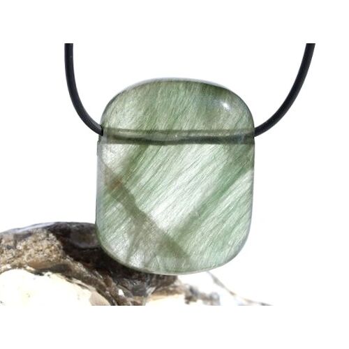 - Besonderheit: Sonderqualität! XXL-große, edel-zeitlose, geometrisch und flach geschliffene Form - flach geschliffene Auflagen - beidseitig tragbar - Sonderbohrdurchmesser! Wunderschöne feine und im entsprechenden Licht und Winkel (z. B. Halogenspot) betrachtet schimmernde, grüne Aktionolithfasern - diese sind im Bergkristall diagonal angeordnet. Der Bergkristall selbst ist kristallin klar/er!