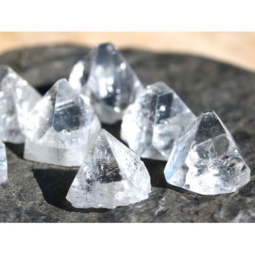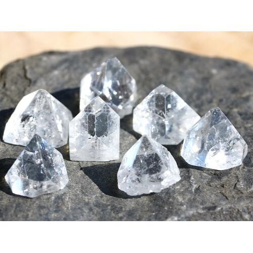 - Form: Naturkristalle mit nach oben zeigende Naturspitzen, Aufstellflächen flach