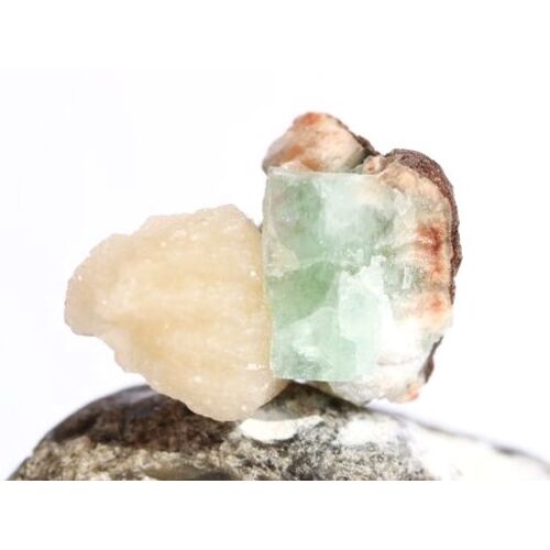 - Besonderheit: Rarität! Natürliche, höhere Kristallstufe mit einem rechteckigeren, aufgewachsenen, grünen Apophyllit-Kristall sowie einen nach oben und in einem leichten Fächer gewachsenen, cemefarbenen Stilbit-Kristall! Im entsprechenden Licht und Winkel betrachtet (z. B. Halogenspot oder Sonne) = Oberflächenschimmer bis -glanz!