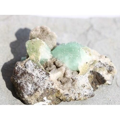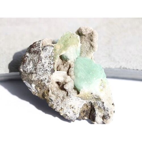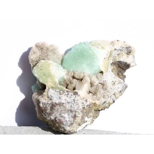 - Form: flachere Naturkristallstufe mit aufgewachsenen grünen Apophyllit-Kristallen sowie etwas Stilbit, flach geschliffene Aufstellfläche