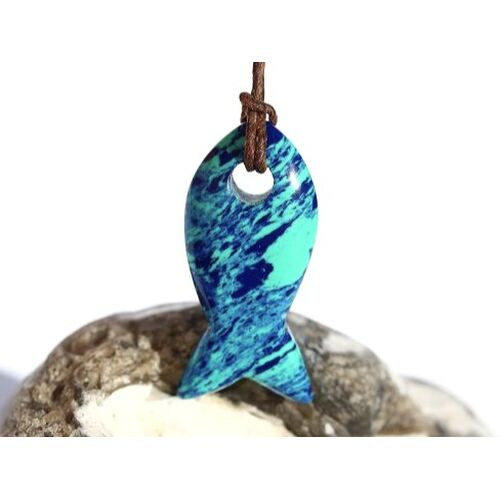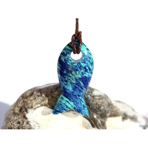- Besonderheit: Sonderqualität - Rarität! Wunderschöner, farblich intensiver, gebohrter und geschliffener Azurit-Malachit-Schmuckstein in Fisch-Form - interessante Farbstruktur - beidseitig tragbar - große Frontbohrung!